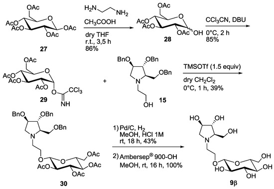 In order to reduce the overall number of synthetic steps necessary to access the glucosyl acceptor in the final glucosylation with trichloroacetimidate 18, we also designed and prepared a series of pseudodisaccharide derivatives 9–11 (Scheme 1) containing a DAB-1 nucleus and a remaining d-glucose unit linked through a 2, 3 or 4-carbon atoms spacer.