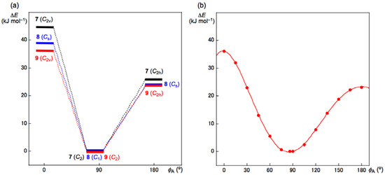 In the case of φ(CEE’C) (= φA), the values for 1a–6e from the corresponding values of 7–9 are given by ΔφA(E, E’: nx) = φA(E, E’: nx) − φA(E, E’: MeEE’Me), where n = 1–6; x = a–e; and E, E’ = S and Se. The absolute values of φA will be used to estimate ΔφA. The magnitudes of the values are ΔφA(E, E’: nx) ≈ 58° for 3d, 31° < ΔφA(E, E’: nx) < 35° for 1a–1c and 1e, ΔφA(E, E’: nx) ≈ 25° for 2b, and 10° ≤ ΔφA(E, E’: nx) ≤ 20° for 1d, 3e, 4e and 6d. The magnitudes of ΔφA(E, E’: nx) are less than 10° (−10° ≤ ΔφA(E, E’: nx) ≤ 10°) for others, except for ΔφA(E, E’: nx) ≈ –12° for 5d and 6d and ΔφA(E, E’: nx) ≈ −20° for 2e, 4a and 5e. The results must be the reflection from the easy deformation in φA. To evaluate the energy for the deformation in φA, 7–9 were optimized assuming φA = 0° and 180°, in addition to the fully optimized structures (85° ≤ φA ≤ 86°). They were optimized to be 7 (C2v), 8 (Cs) and 9 (C2v) at φA = 0° and 7 (C2h), 8 (Cs) and 9 (C2h) at φA = 180°. In the case of 9, the structures were further optimized with φA fixed every 15° for 0° ≤ φA ≤ 180°. The results are summarized in Table S1 of the Supplementary Materials. Figure 2 shows the plot of the energies for the optimized structures versus φA. The energy seems less than 15 kJ mol−1 for 45° ≤ φA ≤ 135° in 9. The energy for the deformation of φA in 7 and 8 seems comparable to that in 9. The very easy deformation in φA is well demonstrated, exemplified by 7–9, which supports the results shown in Table 1. Such easy deformation in φA is also reported for some dichalcogenides [62].