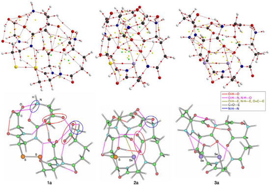 The following are available online at http://www.mdpi.com/1420-3049/23/2/443/s1, Scheme S1: QTAIM-DFA: Plot of Hb(rc) versus Hb(rc) − Vb(rc)/2 for weak to strong interactions, Scheme S2: Rough classification of interactions by θ and θp, together with kb(rc) (= Vb(rc)/Gb(rc)), Equations (S1)–(S7), Table S1: The energies for 7–9 of the optimized structures and partially optimized structures with φA, fixed suitably, with M06-2X/BSS-A, Table S2: Number of the O–H---O (Int A), O–H---N, N–H---O (Int B), N–H---N (Int C), HBs with the E(E’)---H–O(N) and E(E’)---C = O (Int D) and E(E’)---O = C and E(E’)---NH–C = O (Int E) interactions in 1–6, evaluated with M06-2X/BSS-A, Table S3: The relative energies (Erel) of REE’R, (R–H + R–H) and MeE–E’Me for 4a–6e, evaluated with M06-2X/BSS-A, Table S4: QTAIM-DFA parameters and QTAIM functions at BCPs for the E–E’ bonds in 4a–6e and 7–9, a together with the frequencies (ν) and force constants (kf), corresponding to the E-∗-E′ bonds in question, Table S5: NAO bond orders for 1a–6e and 7–8, Figure S1: Polar (R, θ) coordinate representation of Hb(rc) versus Hb(rc) − Vb(rc)/2, with (θp, κp) parameters, Figure S2: Molecular graphs of 2b–2e, drawn on the optimized structures, Figure S3: Molecular graphs of 3b–3e, drawn on the optimized structures, Figure S4: Molecular graphs of 5b–5e, drawn on the optimized structures, Figure S5: Molecular graphs of 6b–6e, drawn on the optimized structures, Figure S6: Molecular graphs of 7–9, drawn on the optimized structures, Figure S7: Plots of Erel of REE’R and (2R–H + MeEE’Me) for 4a–e (CysSSCys), 5a–e (CysSSeCys) and 6a–e (CysSeSeCys), evaluated with M06-2X/BSS-A, Figure S8: Trajectory plots of ρb(rc) drawn on the S–S–C planes of 1a–1e, similarly to the case of Figure 6 in the text. Color and marks are same as those in Figure 6, Figure S9: Plots of Hb(rc) versus Hb(rc) − Vb(rc)/2 for 1a–3e and 7–9, Figure S10: Plots of Hb(rc) versus Hb(rc) – Vb(rc)/2 for 4a–4e and 7, Figure S11: Plots of Hb(rc) versus Hb(rc) − Vb(rc)/2 for 5a–6e and 7–8, Figure S12: Plots of ρb(rc) versus NAO bond orders for 1a–6e and 7–8 and Cartesian coordinates and energies of all the species involved in the present work.
