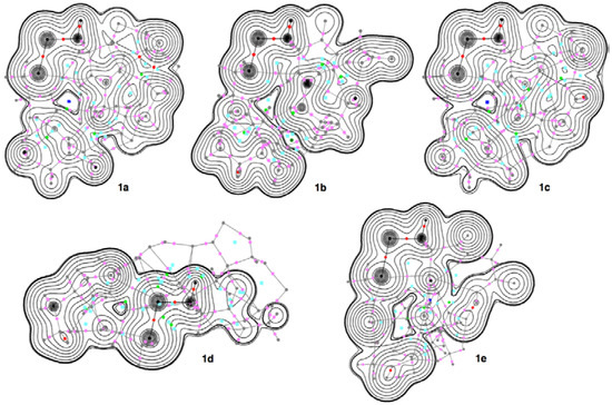 Figure 7 shows the contour plots of ρ(r), exemplified by 1a–1e, which are drawn on an SSC plane of 1a–e. The plots show that each BCP on E-∗-E’ exists at the three-dimensional saddle point of ρ(r). Figure 8 illustrates the Negative Laplacian, exemplified by 1a–1e, similarly drawn on an SSC plane. All BCP on E-∗-E’ of 1a–1e exist in the red area of the plots, which means that the BCPs are all in the range of ∇2ρb(rc) < 0. Therefore, E-∗-E’ of 1a–1e are classified by SS (shared shell) interactions. (See also Figure S8 of the Supplementary Materials for the trajectory plots for 1a–1e.)