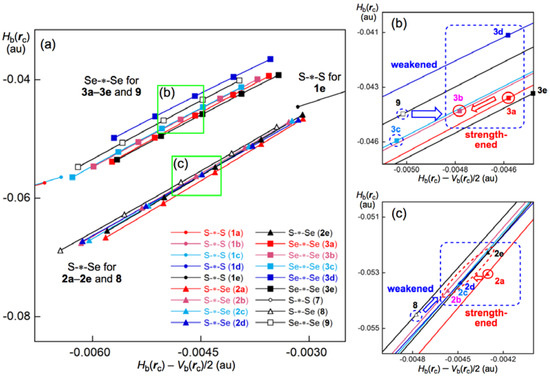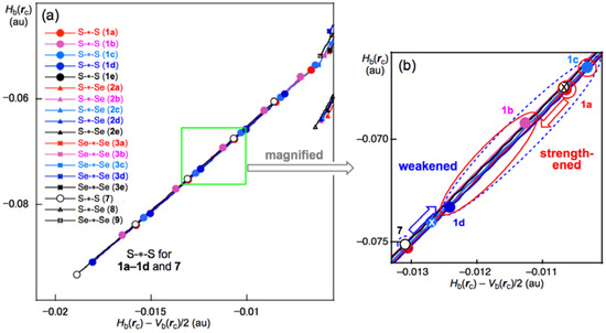 All data in Table 2 and the perturbed structures of 1a–3e and 7–9 are plotted in Figure S9 of the Supplementary Materials. All data for the fully optimized structures of 1a–6e and 7–9 appear in the range of Hb(rc) < 0 and Hb(rc) − Vb(rc)/2 < 0. Therefore, the E–E’ interactions of 1a–6e and 7–9 are all classified by SS (shared shell) interactions, irrespective of the substantial elongation of the S-∗-S bond length by the perturbation that occurred in the conformers, such as S–S in 1e. The plots are analyzed according to Equations (S3)–(S6) of the Supplementary Materials, by applying QTAIM-DFA.