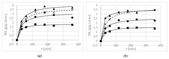 The model proposed by Peleg [30] was employed to fit the experimental results. In this work, WL and SG data (Equations (2) and (3)) were fitted using this Peleg’s model: