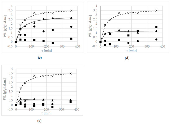 To evaluate the goodness of fit of the models in different solutions, parameter values of modeling WL using Peleg’s model are shown in Table 4. The use of Peleg’s modeling of OD was effective in all of the concentrations of erythritol and xylitol solutions—the goodness of fit has high R2 values, and low RMSE and χ2 values (Table 4). In the case of other solutions, modeling WL using Peleg’s model was effective only at 40% concentrations—in the other cases, values for parameter CRV were more than 20%, which indicates that the model could not be used for the prediction of WL.
