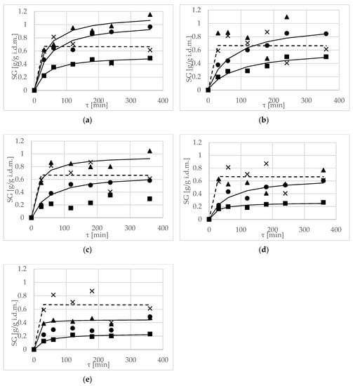 Values of k1, k2, R2, χ2, CRV and RMSE of modelling SG using Peleg’s model are shown in Table 6. According to the data in Table 6, the k1 for all kinetic terms of mass transfer decreased with increasing concentrations of the osmotic solution, at a constant solution temperature. High values for the k1 parameter indicated a low mass transfer rate. The k2 parameter defines the equilibrium moisture content and soluble solids—achieved values were higher compared to modeling WL using Peleg’s model (i.e., the effect of water removal was smaller). Evaluating the goodness of fit of SG using Peleg’s model was different compared to modeling WL parameters. The use of Peleg’s modeling of OD was effective in all of the concentrations only in the case of the erythritol solution. This model can also be used for the prediction of SG at 20% and 30% concentrations, using xylitol and inulin, but not at the highest concentrations. In the cases of 20% maltitol and 30% oligofructose, values of the CRV parameter were more than 20%, indicating that the model cannot be used for modeling of SG during OD.