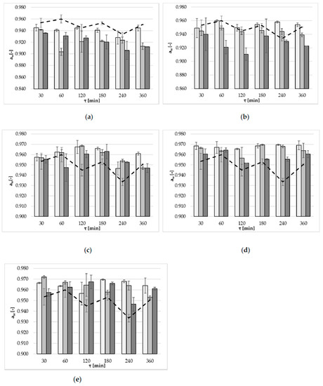 A direct relationship between the increase in solution concentration, and the decrease of water activity level, was observed mainly in the case of OD using xylitol (Figure 3b). This relationship was not observed when maltitol, inulin and oligofructose solutions were used (Figure 3c–e). Statistically significant influences (α = 0.05) of aw were observed of all the factors: type of osmotic agent, solution concentration, and time (Table 8). Important decreases in the values for aw were observed mainly at the end of the OD process. Higher concentrations of osmotic solutions resulted in lower values of this parameter. The lowest average values were obtained for erythritol (approximately 0.928), and xylitol (0.942). This is evident in the bar graphs, which are below the line graph referring to the aw of apple dehydrated in a 50% sucrose solution (Figure 3a,b). Values for aw during OD in maltitol, inulin and oligofructose solutions were classified into one homogeneous group, which means that the influence of these types of osmotic solutions, on the decrease of aw, was not significant (Table 8). Higher values of aw achieved with maltitol, inulin and oligofructose were related to small WL, compared with sucrose, as discussed above.