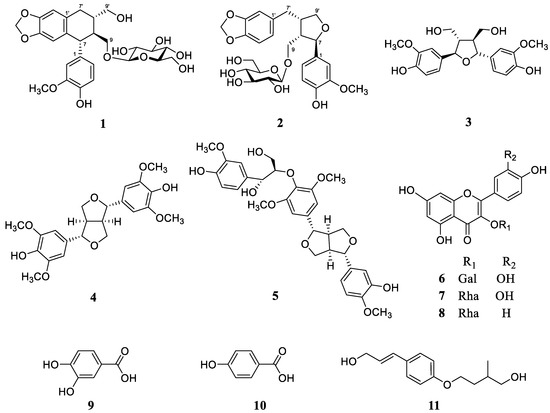 - Zhao, C.; Nagatsu, A.; Hatano, K.; Shirai, N.; Kato, S.; Ogihara, Y. New Lignan Glycosides from Chinese Medicinal Plant, Sinopodophillum emodi. Chem. Pharm. Bull. 2003, 51, 255–261. [Google Scholar] [CrossRef] [PubMed]