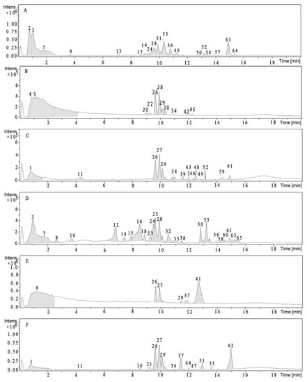 Representative total ion chromatogram (TIC) of (A) edible portion EP, (B) edible portion acidic NEP, (C) edible portion alkaline NEP, (D) inedible portion EP, (E) inedible portion acid NEP, and (F) inedible portion alkaline NEP in positive ion mode by UPLC-Q-TOF-MSE.