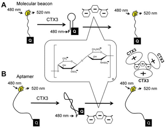Turn-on fluorescence detection of heparin based on competitive binding (A) between heparin and molecular beacon (MB) to CTX3 or (B) between heparin and aptamer to CTX3.