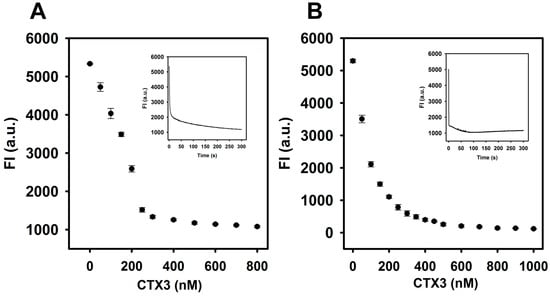 Fluorescence intensity at 520 nm of aptamer and A12-MB-A12 was reduced by titrating with CTX3: (A) FAM/DABCYL-labeled aptamer (20 nM) and (B) A12-MB-A12 (10 nM) were titrated with indicated CTX3 concentrations. The experiments were conducted at 30 °C. (Inset of A) time course measurement of FAM intensity (520 nm) of aptamer upon the addition of 300 nM CTX3; (Inset of B) time course measurement of FAM intensity of MB upon the addition of 200 nM CTX3.