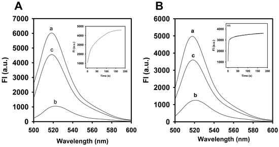 Fluorescence spectra of aptamer and A12-MB-A12 in the absence or presence of CTX3 and heparin: The incubation time of CTX3-aptamer or CTX3-MB sensors with heparin was 5 min. (A) fluorescence spectra of (line a) 20 nM aptamer, (line b, line c) 20 nM aptamer and 300 nM CTX3 in the absence and presence of 1.8 μg/mL heparin. (Inset) Time course measurement of fluorescence intensity (520 nm) of a solution containing 20 nM aptamer and 300 nM CTX3 upon the addition of 1.8 μg/mL heparin. (B) fluorescence spectra of (line a) 10 nM MB, (line b, line c) 10 nM MB and 200 nM CTX3 in the absence and presence of 1.8 μg/mL heparin. (Inset) Time course measurement of fluorescence intensity (520 nm) of a solution containing 10 nM MB and 200 nM CTX3 upon the addition of 1.8 μg/mL heparin.