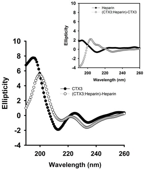 The CD spectra of CTX3 and CTX3-heparin complexes. As shown in Figure 3, the addition of 1.8 μg/mL heparin notably detached CTX3 (300 nM) from aptamer. Thus, the CD spectra were measured at a CTX3 concentration of 300 μM and a heparin concentration of 100 μM (1800 μg/mL, MW of heparin ~18,000) in 10 mM 4-(2-hydroxyethyl)piperazine-1-ethanesulfonic acid (HEPES) (pH 8.0). The CD spectrum of CTX3-heparin complexes was subtracted by that of heparin. (Inset) The CD spectrum of CTX3-heparin complexes was subtracted by that of CTX3.