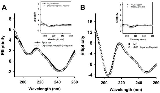 The CD spectra of aptamer and MB in the absence or presence of heparin. As shown in Figure 9A,B, the addition of 0.36 μg/mL (20 nM, MW ~ 18,000) notably detached CTX3 from aptamer (20 nM) or MB (10 nM). Thus, two-fold molar excess of heparin over aptamer and MB was used. The CD spectra were measured at an aptamer concentration of 35 μM, a MB concentration of 35 μM and a heparin concentration of 70 μM in 10 mM HEPES (pH 8.0). (A) the CD spectrum of aptamer-heparin mixtures was subtracted by that of heparin. (Inset) The CD spectrum of aptamer-heparin mixtures was subtracted by that of aptamer; (B) the CD spectrum of MB-heparin mixtures was subtracted by that of heparin. (Inset) The CD spectrum of MB-heparin mixtures was subtracted by that of MB.