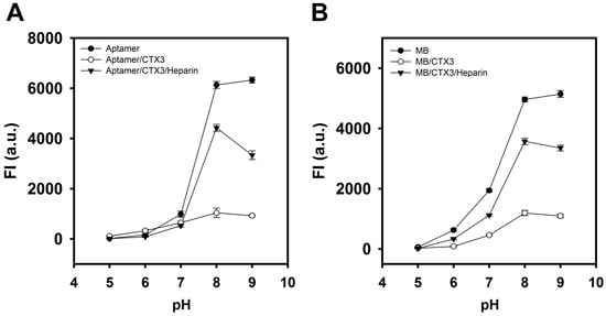 The effect of pH on the FAM fluorescence of aptamer, MB, CTX3-aptamer complexes, and CTX3-MB complexes was also investigated in the pH range 5–9. As shown in Figure 7, the fluorescence intensity of aptamer and MB alone reached its maximum at pH 8–9. The addition of CTX3 caused a maximum reduction in FAM fluorescence of aptamer and MB at pH 8–9. Upon the addition of heparin, maximal fluorescence recovery of CTX3-aptamer and CTX3-MB complexes was noted at pH 8. Thus, pH 8 was selected for conducting the experiments in the present study.
