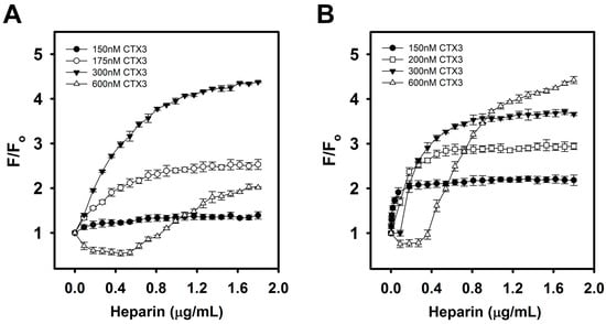 Effect of varying CTX3 concentrations on the turn-on fluorescence of CTX3-aptamer or CTX3-MB sensors upon the titration of indicated heparin concentrations: (A) aptamer and (B) MB were incubated with varying CTX3 concentrations for 5 min, and then CTX3-aptamer or CTX3-MB sensors were titrated with the indicated heparin concentrations.