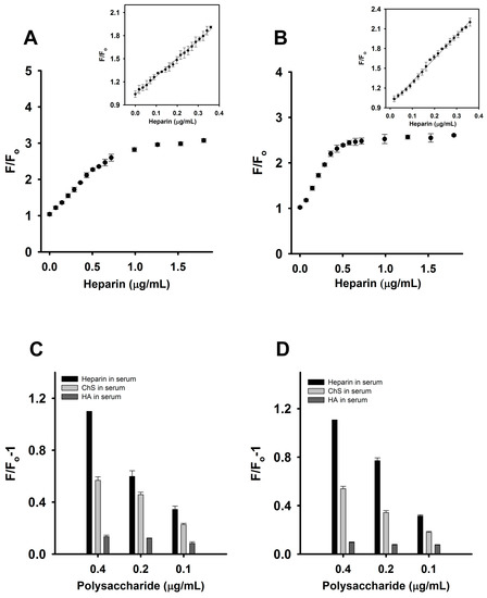 Determination of heparin in plasma samples: Fo and F corresponded to the fluorescence intensity of FAM at 520 nm in the absence or presence of heparin, respectively. (A) changes in the fluorescence intensity of solutions of 20 nM aptamer and 300 nM CTX3 in the presence of heparin-spiked plasma samples. (Inset) A plot of the F/Fo value versus the spiked concentrations of heparin; (B) changes in the fluorescence intensity of solutions of 10 nM MB and 200 nM CTX3 in the presence of heparin-spiked plasma samples. (Inset) A plot of the F/Fo value versus the spiked concentrations of heparin. Changes in the fluorescence intensity of (C) CTX3-aptamer and (D) CTX3-MB sensors upon the addition of heparin-, ChS- and HA-spiked plasma samples. Fo and F corresponded to the fluorescence intensity at 520 nm of FAM as measured from CTX3-aptamer and CTX3-MB sensor in the absence or presence of plasma samples spiked with indicated heparin, ChS and HA concentrations.