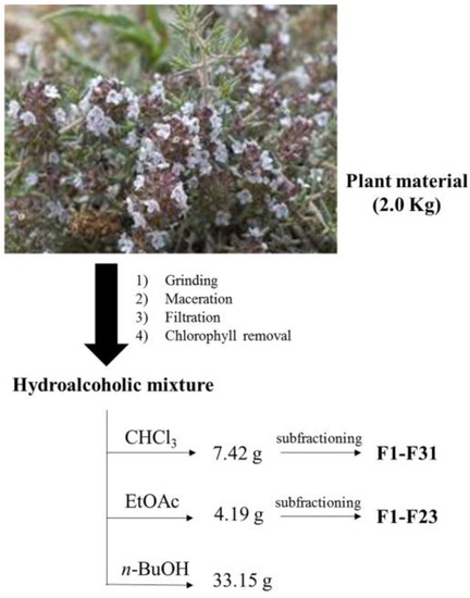 The air-dried aerial parts (leaves and flowers, 2.0 kg) of T. algeriensis were powdered (slight grinding at controlled temperature, up to 35 °C) and macerated at room temperature with EtOH–H2O 70:30, (v/v) (15 L) for 24 h, four times with fresh solvent. After a filtration step, the extracts were combined, concentrated under reduced pressure, diluted in H2O (800 mL) under magnetic stirring and maintained at 4 °C overnight to precipitate chlorophylls. After a second filtration step, the resulting solution was extracted with solvents with increasing polarities (chloroform, ethyl acetate and n-butanol). Each extract was dried with anhydrous Na2SO4, filtered over Chromafil® PET 20/25 (0.2 µm pore size, Machery-Nagel AG, Oensingen, Switzerland) into brown glass vials and concentrated under vacuum (up to 35 °C) to yield the following extracts: CHCl3 (7.42 g), EtOAc (4.19 g), n-BuOH (33.15 g).
