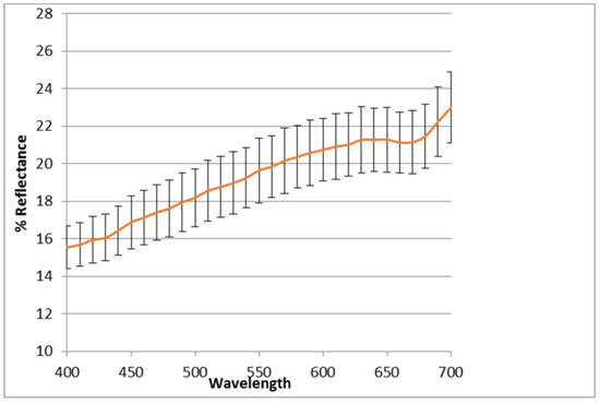 It is not possible to give an interpretation for comparison of this CIELAB colorimetric analyses, because only few data are available in literature about colorimetric studies on aerial parts in general, and no data are disposable for this plant in particular. Moreover, as known, the colorimetric parameters are deeply influenced by several different factors [24,25], among which storage temperature, humidity, light exposition, besides the standard conditions applied, according to the Commission Internationale de l'Éclairage (CIE). In this work a D65 illuminant, sunlight simulating, with an observer angle of 10°, was used. Reflectance curve is reported in Figure 2. Only a weak yellow parameter (light positive b*) can be shown, in line with the phenolic profile denoted by the HPLC analysis.