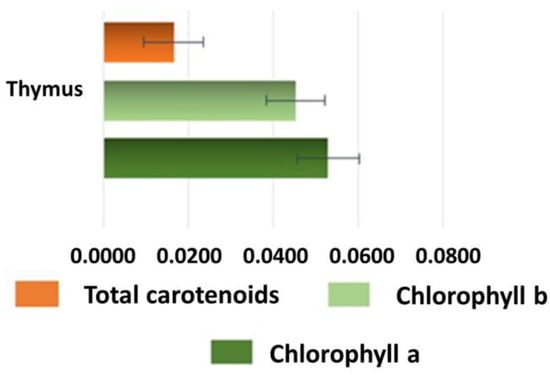 The total carotenoids and chlorophylls a and b analysis in Thymus sample was performed according to Solovchenko with some modifications [20]. The sample was homogenized with mortar and pestle in 5 mL of chloroform-methanol (2:1, v/v) containing 0.01% butylated hydroxytoluene (BHT) to inhibit peroxidation process. Moreover, homogenization was carried out with 50 mg of MgO to prevent chlorophyll pheophytinization. The homogenate was passed through a paper filter and after, distilled water was added to the amount of 0.2 of the extract volume. Finally, the mixture was centrifuged in glass tube test for 18 min at 3000 g at 10 °C to complete separation of chloroform fraction from methanol/aqueous one. The chloroform phase (lower phase) contained the hydrophobic molecules (chlorophylls, carotenoids, lipids, etc.), while the methanol-water phase (upper phase) contained the hydrophilic molecules. Absorption spectrum of the chloroform phase was recorded with a Beckman Coulter DU 800 instrument in the range of 350–800 nm with a spectral resolution of 0.5 nm at a temperature of 20 °C. Both chlorophylls and the total carotenoid contents were determined using absorption coefficient according to Wellburn (1994) [21]. Equations to determine the concentrations of chlorophyll a (Ca) and b (Cb), as well as total carotenoid (Ctot) contents are reported below: