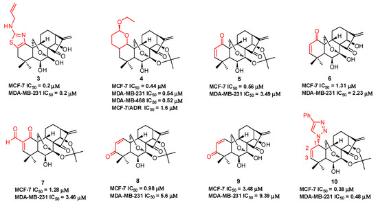 | Oridonin (1) | MCF-7: 6.6 μM; MDA-MB-231: 29.4 μM; MDA-MB-468: 5.3 μM; MCF-7/ADR: 34.8 μM; HepG2: 15.2 μM; MGC-803: 9.06 μM; Bel-7402: 5.41 μM; K562: 4.33 μM | [45,46,47,48,49,53] |
