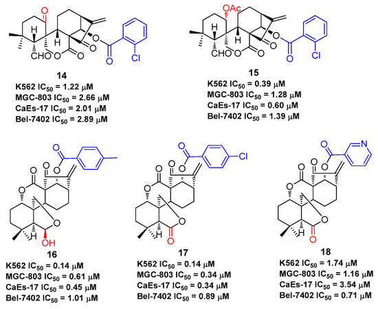 | 14 | K562: 1.22 μM; MGC-803: 2.66 μM; CaEs-17: 2.01 μM; Bel-7402: 2.89 μM | [54] |