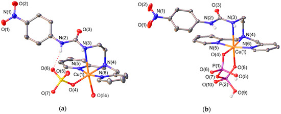 The solid state structures of different complexes of L4 were investigated by using X-ray diffraction measurements. Table 1 presents the bond distances of the metal coordination environments, while views of the structures are shown in Figure 1 and Figure 2. The complexes differ in the nature of the metal ion (Zn2+ or Cu2+) and the anion (sulphate or pyrophosphate). The Cu2+ ions in [CuL4(SO4)] and [CuL4(H2PPi)] complexes present octahedral coordination with a strong Jahn-Teller distortion [57]. The ligand adopts an ‘open wing butterfly’ conformation that is similar to those observed for the Cu2+ complexes of L2 [49]. The equatorial plane of the coordination polyhedron in [CuL4(SO4)] is defined by the donor atoms of the dipicolylamine unit [N(4), N(5) and N(6)] and an oxygen atom of the anion [O(4)] (mean deviation from planarity: 0.04 Å), with the metal ion being placed 0.01 Å below this plane in [CuL4(SO4)] and 0.12 Å above it in [CuL4(H2PPi)]. The apical positions in [CuL4(SO4)] are occupied by one of the nitrogen atoms of the urea subunit [N(3)] and an oxygen atom of a sulphate anion of an adjacent complex molecule [O(5b)] (Figure 1). Thus, the presence of μ2–η1:η1-sulphate anions bridging two neighboring complex molecules leads to the formation of a coordination polymer (Figure S1, Supplementary Materials). In [CuL4(H2PPi)], the apical positions are delineated by one of the nitrogen atoms of the urea subunit [N(3)] and an oxygen atom of the H2PPi2− anion [O(8)], which coordinates in a κ2-H2PPi2− mode forming a six-membered chelate ring.