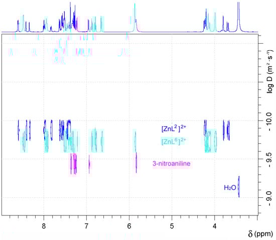The 1H-NMR spectra of the Zn2+ complexes of both L1 and L2 recorded in wet dmso-d6 were observed to change over time, which caused an increase of the number and complexity of the signals (Figures S3 and S4, Supplementary Materials). This suggests that both [ZnL1]2+ and [ZnL2]2+ complexes hydrolyse in aqueous solution to form the [ZnL6]2+ complex (Scheme 3), 2-aminophenylboronic acid or 3-nitroaniline, and carbon dioxide. The presence of a 3-nitroaniline molecule in the molecular structure of [CuL2(μ-SO4)]2 reported recently also points in this direction [50]. In the case of [ZnL2](ClO4)2, new resonances appear in the 1H-NMR spectrum from 7.35 to 6.60 ppm, none of which correspond to the complex or the free ligand. The presence of a signal at 6.94 ppm due to 3-nitroaniline confirmed the hydrolysis of the complex. The relative intensity of the signals attributable to the [ZnL2]2+ species and 3-nitroaniline indicate that 6% of the complex has hydrolysed after four hours at room temperature, while after 48, 96, and 168 h this percentage increases to 28%, 43%, and 49%, respectively. A similar situation was observed for [ZnL1]2+, which hydrolysed to a slightly lower extent after 4 h (~5%). 1H DOSY experiments performed for [ZnL2]2+ 168 h after dissolution of the complex allowed discriminating the three species that are present in solution on the basis of their different diffusion coefficients (Figure 3). Taking the diffusion coefficient of dmso-d5 as a reference (D = 6.81 × 10−10 m2·s−1) [64], these studies provided diffusion coefficients D at 25 °C of 1.34 × 10−10 m2·s−1, 1.85 × 10−10 m2·s−1, and 3.64 × 10−10 m2·s−1 for [ZnL2]2+, [ZnL6]2+, and 3-nitroaniline, respectively.