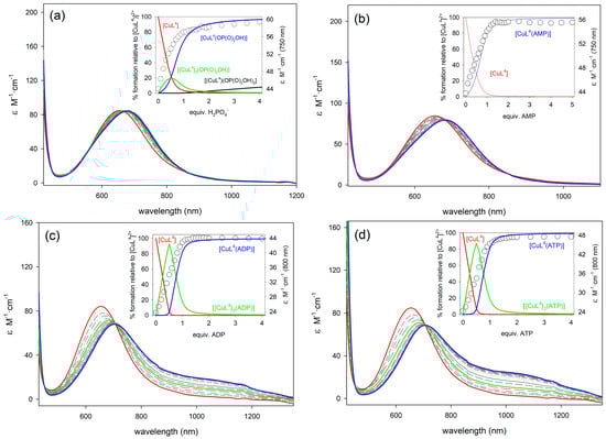 Family of UV/vis spectra taken during the course of the titration of [CuL4]2+ (5 × 10−3 M in H2O, pH 7.0, MOPS 0.1 M, 25 °C) with standard solutions (0.5 M) of: (a) NaH2PO4; (b) Na2AMP; (c) Na2ADP; and, (d) Na2ATP. Insets: titration profiles at selected wavelengths vs equivalents of anion and species distribution diagram.