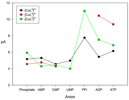 The comparison of association constants obtained with different equilibrium models may be misleading. Thus, we used pA values defined as pA = −log[Anion]free using an anion concentration of 0.001 M and a concentration of [CuLn]2+ complex of 0.01 M (pH 7.0). The definition of pA is similar to that of pM often used to assess the relative stabilities of metal complexes in aqueous media [74]. The pA values obtained for all of the monophosphate anions are rather similar (Figure 5, see also Table 3), with no particular selectivity for any of them being observed. When considering the spectral changes that were displayed during the titrations, this suggests monodentate coordination of the phosphate anion to the metal center in the 1:1 complexes. The values obtained for the anions containing two or three phosphate units are clearly higher, particularly in the case of [CuL4]2+ and [CuL5]2+. This can be attributed, at least in part, to a bidentate coordination of the anion to the metal center, which for [CuL3]2+ and [CuL4]2+ triggers the de-coordination of the urea nitrogen atom. However, the nature of the receptor results in rather different stabilities. The pA values obtained for [CuL3]2+ and [CuL5]2+ show a similar trend, with the highest stability being observed for PPi. However, [CuL5]2+ shows higher pA values than [CuL3]2+, perhaps because of the more open structure of [CuL5]2+ related to the absence of the urea group. The high selectivity of [CuL5]2+ for PPi over ADP and ATP suggests that the cis-diol groups of the nucleotides are not forming esters with the phenylboronic acid moiety of the ligand.