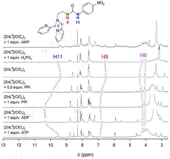 The interaction of the [ZnL4]2+ complex with phosphorylated anions was investigated by using 1H-NMR spectroscopy in dmso-d6 solution, which was selected as solvent in view of the low solubility of the complex in aqueous media. The 1H-NMR signals of the urea protons were particularly informative with respect to the interaction of the anion with the complex (Figure 6). These signals are observed at 9.40 and 6.52 ppm in the spectrum of the [ZnL4]2+ complex, dissolved as the perchlorate salt. The addition of phosphate or AMP does not provoke significant changes in the chemical shifts of the urea protons. However, the signal at 9.40 ppm experiences important shifts to lower fields upon addition of one equivalent of PPi or ADP, shifting to 10.40 and 10.33 ppm, respectively. In parallel, the signal at 6.52 ppm undergoes smaller downfield shifts to 6.89 and 6.81 ppm, respectively. These spectral changes reflect the establishment of hydrogen-bonding interactions involving the urea fragment and the anion [75]. Interestingly, the addition of ATP provokes smaller shifts of the signals of urea protons to 9.53 and 6.88 ppm, which is in line with the lower pA value determined for the association of ATP and [CuL4]2+. A similar behavior is also observed for the [ZnL3]2+ complex, which contains a phenylboronic function (Figure S11, Supplementary Materials).