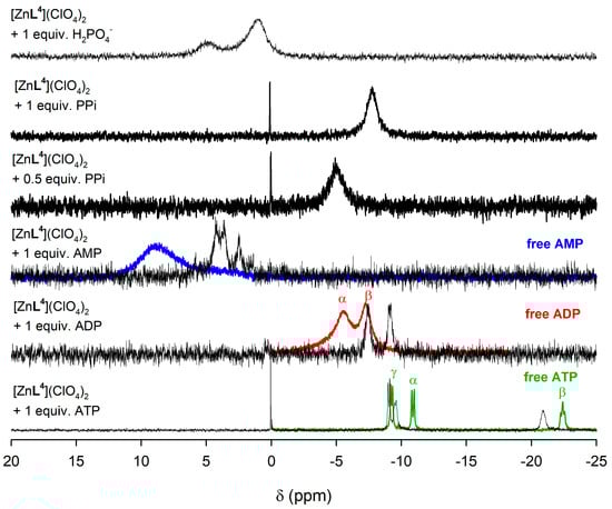 The corresponding 31P NMR spectrum of the ATP adduct (Figure 7) shows three signals at −9.55, −20.92 and −9.05 ppm due to the Pα, Pβ, and Pγ nuclei, respectively. The corresponding chemical shifts measured for the uncoordinated ATP anion are −10.90, −22.42, and −9.26 ppm. The small chemical shift induced by coordination in the signal of Pγ and the relatively large chemical shifts experienced by Pα and Pβ indicates that only the two inner phosphate groups of ATP play a significant role in the coordination to the metal ion. In the case of ADP coordination to the metal ion induces important upfield shifts of the signals of both Pα and Pβ, from −7.29 to −9.13 ppm (Pα) and from −5.56 to −7.46 ppm (Pβ). Taken together, these results indicate that both ADP and ATP coordinate to the metal ion through the phosphate units containing Pα and Pβ, likely in a similar way as observed in the solid state for [{ZnL4}2(μ-PPi)] and [{CuL4}2(μ-PPi)] (Figure 2). It is also worth noting that the spectrum recorded in the presence of ATP of PPi shows a small signal at 0 ppm due to the presence of phosphoric acid, indicating that the complex catalyzes the hydrolysis of the PPi anion and the triphosphate unit of ATP. In the case of [ZnL3]2+, similar 31P chemical shifts are observed, but the higher relative intensity of the signal at 0 ppm for polyphosphorylated anions indicates a higher extent of the hydrolysis process (Figure S12, Supplementary Materials).