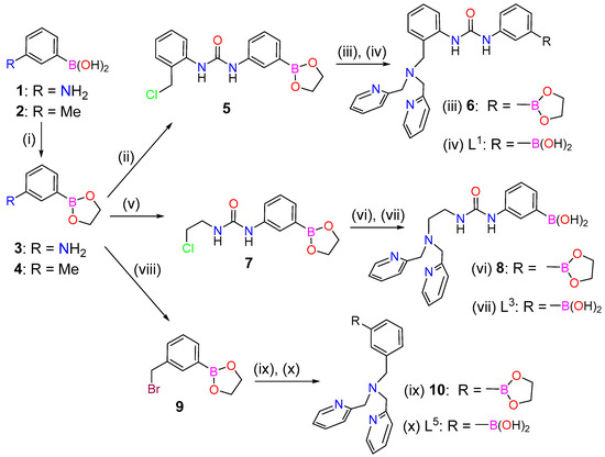The preparation of L2 and the corresponding Cu2+ and Zn2+ complexes using sulphate and nitrate as counterions were described in a previous work [49]. The syntheses of L1 and L3 started from (3-aminophenyl)boronic acid (1), which was protected using ethane-1,2-diol to give compound 3 in quantitative yield (Scheme 1). Compound 3 was subsequently reacted with 1-(chloromethyl)-2-isocyanatobenzene or 1-chloro-2-isocyanatoethane to yield compounds 5 and 7, respectively. Alkylation of bis(pyridin-2-ylmethyl)amine with 5 (or 7) provided compound 6 (or 8), which were purified using MPLC on neutral Al2O3. This afforded directly ligands L1 and L3, thanks to the deprotection of the phenylboronic acid group during the chromatographic separation. The alkylation of bis(pyridin-2-ylmethyl)amine with 5 and 7 were found to proceed in rather low yields (Scheme 1).