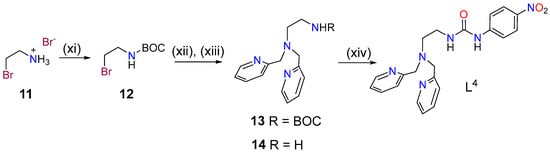 Synthesis of ligand L4: (xi) di-tert-butyl dicarbonate, dioxane, 0 °C, 48 h, 80% (12); (xii) Bis(pyridin-2-ylmethyl)amine, CH3CN, DIPEA, 70 °C, 3 d, 39%; (xiii) trifluoroacetic acid (TFA:CH2Cl2 (1:1), r.t., 16 h, 96%; (xiv) 1-isocyanato-4-nitrobenzene, CHCl3, r.t., 2 h, 85%.