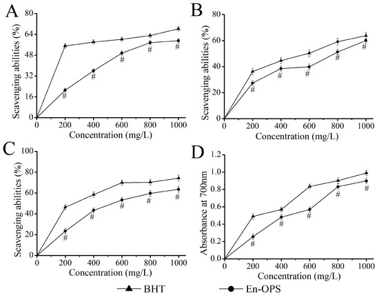 Figure 1. Antioxidant activities of En-OPS in vitro. (A) hydroxyl radical-scavenging abilities; (B) superoxide radical-scavenging abilities; (C) 1,1-diphenyl-2-picrylhydrazyl radical-scavenging abilities; and (D) reducing power. “#” indicated that the values differ significantly at p < 0.05 (En-OPS compared with BHT at different concentration). The statistical significance of the differences between the groups were analyzed using Tukey’s tests in the software package (SAS 9.3). A value of p < 0.05 was regarded as statistically significant.