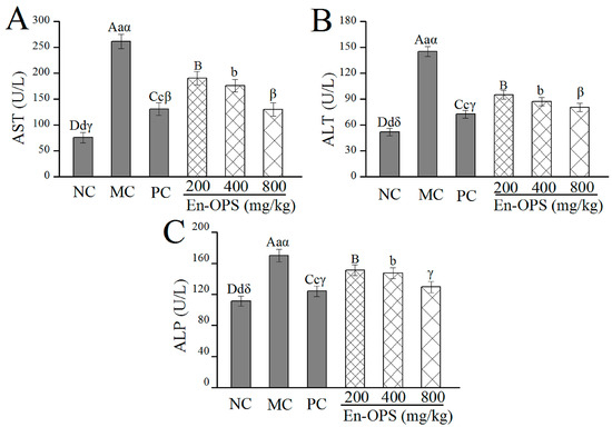 Figure 2. Effects of En-OPS on the enzymic activities in serum of mice. (A) aspertate aminotransferase; (B) alamine aminotransferase; and (C) alkaline phosphatase. The values were reported as the mean ± S.D. of 10 mice per group. Bars with different letters were significantly different (p < 0.05). The statistical significance of the differences between the groups were analyzed using Tukey’s tests in the software package (SAS 9.3). A value of p < 0.05 was regarded as statistically significant.