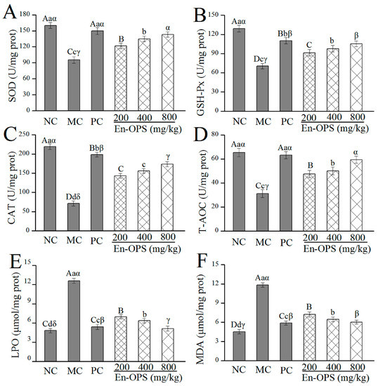 Figure 3. Effects of En-OPS on biochemical parameters in liver of mice. (A) superoxide dismutase; (B) GSH peroxide; (C) catalase; and (D) total antioxidant capacity, and contents of (E) lipid peroxide and (F) malondialdehyde. The values were reported as the mean ± S.D. of 10 mice per group. Bars with different letters were significantly different (p < 0.05). The statistical significance of the differences between the groups were analyzed using Tukey’s tests in the software package (SAS 9.3). A value of p < 0.05 was regarded as statistically significant.