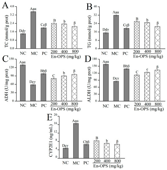 Figure 4. Effects of En-OPS on lipid levels and enzymic activities in liver of mice. (A) total cholesterol levels; (B) triacylglycerols levels; (C) alcohol dehydrogenase activities; (D) aldehyde dehydrogenase activities; and (E) cytochrome P450 2E1 levels. The values were reported as the mean ± S.D. of 10 mice per group. Bars with different letters were significantly different (p < 0.05). The statistical significance of the differences between the groups were analyzed using Tukey’s tests in the software package (SAS 9.3). A value of p < 0.05 was regarded as statistically significant.