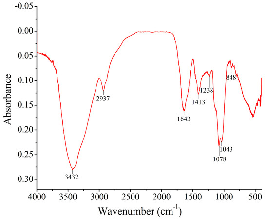 A typical Fourier transform infrared (FT-IR) spectrum of En-OPS was depicted in Figure 6. The broad stretching peak at 3405 cm−1 was characteristic of hydroxyl groups, and the weak absorption peaks at 2927 cm−1 were ascribed to the C–H stretching vibration, which were characteristic absorption peaks of polysaccharide. Moreover, the band at 1640 cm−1 was due to the stretching vibration of C=O and the band in the region of 1420 cm−1 was likely related to O–H bond bending vibrations. The absorption peaks at 1200–1000 cm−1 were ascribed to sugar ring vibrations overlapping with stretching vibrations of C–OH and the C=O=C. The band at about 840 cm−1 indicated the existing of α-glycosidic. Hence, the En-OPS had the typical absorption of polysaccharides [16].