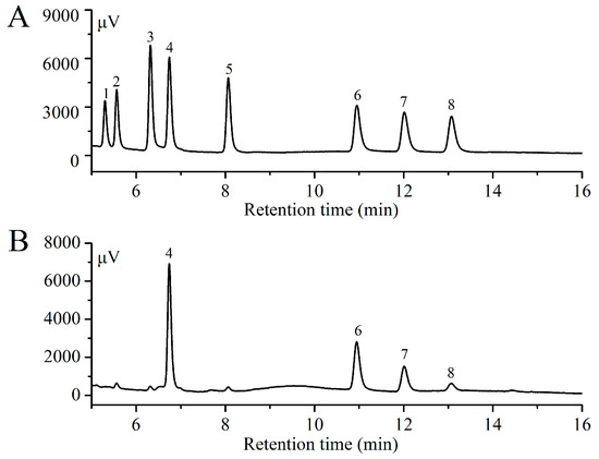 Figure 7. Gas chromatography (GC) chromatograms of monosaccharide. (A) Standard sugars; (B) En-OPS. Peaks: (1) rhamnose, (2) fucose, (3) ribose, (4) arabinose, (5) xylose, (6) mannose, (7) galactose, and (8) glucose.