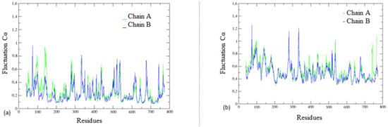 Fluctuation of α-carbon from DPP-4 (PDB: 4A5S [20,21]) at the presence and absence of inhibitor in the chains, with overlap of the two DPP-4 chains for the following systems: (a) dimer with inhibitor only in the chain A; (b) dimer with inhibitor only in the chain B; (c) dimer with inhibitor in both chains; (d) dimer without inhibitor.
