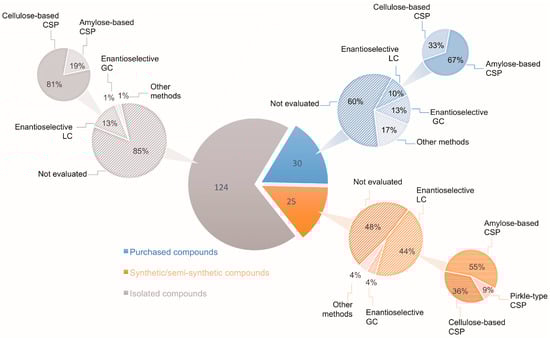 Number of secondary metabolites with AC determined by VOA methods according to Batista et al. [12] and percentage of these compounds for which the enantiomeric composition was evaluated by enantioselective chromatography.