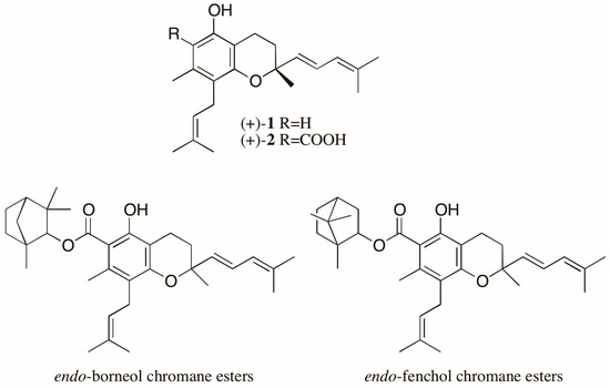 Another noteworthy case involves the trypanocidal prenylated chromanes, peperobtusin A (1) and 3,4-dihydro-5-hydroxy-2,7-dimethyl-8-(3′′-methyl-2′′-butenyl)-2-(4′-methyl-1′,3′-pentadienyl)-2H-1-benzopyran-6-carboxylic acid (2) (Figure 3), isolated as racemates from Peperomia obtusifolia (Piperaceae) [21]. From this same plant, eight monoterpene chromane esters were also isolated. Four of them were elucidated as esters of both enantiomers of chromane 2 with both enantiomers of endo-borneol, while the other four were characterized as both enantiomers of chromane 2 esterified with both enantiomers of endo-fenchol (Figure 3) [22,23]. The biological activities of the stereoisomers of these chromanes were not evaluated, but reports found in the literature show different trypanocidal activity for the enantiomers of a prenylated chromene isolated from another Piperaceae species, Piper gaudichaudianum. Interestingly, in this case, mixtures of enantiomers showed a synergistic effect, with the racemate being the most active [24].