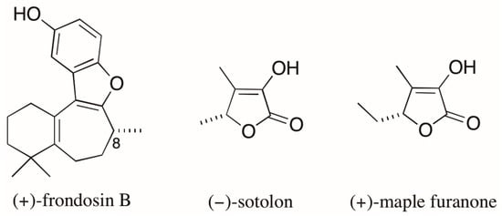 Structures of (+)-frondosin B, (−)-sotolon, and (+)-maple furanone.