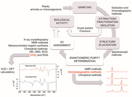 The study of natural products generally involves the following steps: extraction, fractionation, isolation, structural elucidation, and in the case of chiral molecules, enantiomeric purity and AC determinations (Figure 5). In the search for bioactive compounds or bioguided extraction, these steps must be accompanied by biological assays for the evaluation of the desired activity. It is important to emphasize that due to the possible differences in the biological activity of enantiomers and other stereoisomers, the enantiomeric or stereochemical purity of the isolated substances should always be monitored.
