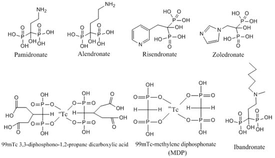 In order for bone-seekers to be targeted, they require suitable bone-seeking ligands or tracers. After administration, these ligands carry the radionuclide to the binding sites of bone tissue. Therefore, bone localization is related to properties of the ligand or tracer, while the radionuclide mainly accounts for the molecular imaging of the compound [4]. Bisphosphonates (BPs) are a group of well-known drugs, which are considered the backbone in the treatment of osteoporosis. BPs show high affinity for bone tissues and inhibit bone resorption by being selectively taken up and adsorbed to the mineral surfaces in bone [5]. BPs can mainly be classified into two groups: simpler non-nitrogen containing BPs, such as etidronate and clodronate; and the most potent nitrogen-containing BPs, including pamidronate, alendronate, risedronate, ibandronate and zoledronate (Figure 1) [6]. The high affinity of BPs for bone tissue make them very suitable to be used as tracers or ligands in a bone-seeker complex with radioisotopes, such as 99mTc. The examples of 99mTc-BP complexes are 99mTc-methylene diphosphonate (99mTc-MDP), 99mTc-3,3-diphosphono-1,2-propane dicarboxylic acid (99mTc -DPD), 99mTc-3,3-1,2-ethanediylbis[nitrilobis-(methylene)]tetrakis-phosphonic acid (99mTc-EDTMP) and 99mTc-TEDP (Figure 1) [7,8]. These complexes are involved in routine bone imaging for diagnosis and evaluation of primary tumor uptake and checking for bone metastases [9]. These agents are non-hydrolysable analogues of pyrophosphate. The phosphorus–carbon–phosphorus backbone results in chelation of calcium ions and high affinity for bone mineral. BPs have high selectivity for osteoclasts due to their ability to target bone. The real mechanism of BPs involves the competitive inhibition of human farnesyl pyrophosphate synthase (HFPPS) [10]. The anti-cancer activity of BPs is well recognized and reviewed in many studies [11]. BPs are accepted as treatment for malignant bone disease because they are efficient inhibitors of osteoclast-mediated bone resorption [12]. In women with advanced breast cancer and bone metastases, BPs reduce the incidence of hypercalcemia and skeletal morbidity [13]. The concept of repurposing BPs for the treatment of different types of cancer, including bone and breast cancer, is now a hot spot for scientific investigation in the scientific world [14].