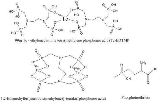 l-Phosphinothricin (l-homoalanine-4-yl-(methyl)-phosphinic acid or glufosinate) is the active ingredient of the non-selective herbicide BASTA. Phosphinothricin, which inhibits glutamine synthetase [15], is a structural analog of glutamate. The result is the rapid accumulation of a high concentrations of ammonia and depletion of glutamine in the plant. This effect leads to a rapid decline of photosynthetic CO2-fixation, resulting in plant death. The results of several toxicological studies show that phosphinothricin are safe for users, with an LD50 of 2170 mg/kg after oral administration in rats [15,16,17]. The drug is considered theoretically safe for humans, as its target enzyme, glutamine synthetase, is not found in humans or animals. The chemical structure of phosphinothricin exhibits structural similarity with BPs, which have encouraged us to investigate their potential as bone-seekers in nuclear imaging and their anti-cancer activity.