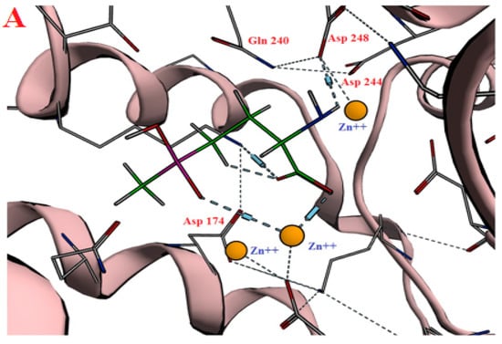 BPs act by inhibition of human farnesyl pyrophosphate synthase (HFPPS) through binding to the catallytic active site and coordinating with the three divalent metal ions at this site. The similarity of structures for different analogues with an isosteric group for the phosphonate was studied. As a result of a long screening process using many compounds with structural similarity to BPs, phosphinothricin was suggested. Phosphinothricin has a carboxylic moiety instead of the phosphonate. In addition, it has an amino group that features in all nitrogenous BP in addition to a methyl phosphonate moiety. To answer our questions, we started with an in silico docking study of phosphinothricin against HFPPS was performed with comparisons made to alendronate, a well-known BP that has a similar structure. The docking study showed that phosphinothricin contained two well-orientated positions, one of which showed three hydrogen bonds with most of the important residues at the active site, such as Asp248, Gln240 and Asp174 in addtion to three coordinates shared with Zn+2 (Figure 2A). Another position showed an additional hydrogen bond with Asp107 and another electrostatic bond with Lys200 (Figure 2B). The free energy of binding (ΔG) of phosphinothricin was −25.60 (kcal/mol) with an in silico affinity (pki) of 37.54 when compared with alendronate, which had a ΔG of −27.61 (kcal/mol) with an in silico affinity (pki) of 40.54 (Table 1). The predicted orientation of alendronate included hydrogen bonding with Asp248, Gln240, Thr201, Lys257, Asp107 and Asp174 (Figure 3).