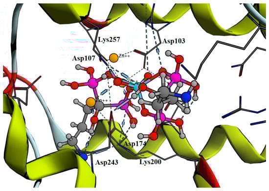 The predicted mode of binding for Tc-phosphinothricin included hydrogen bonds with Lys257, Gln96 and Asp103 in addition to coordinating with the three Zn+2 ions (Figure 4). On the other hand, Tc-alendronate complex showed hydrogen bonds with Lys257, Gln96, Asp103 and Asp174 (Figure 5).