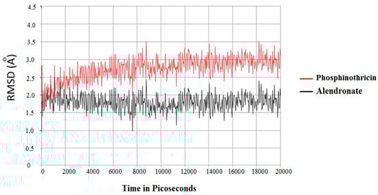 Molecular dynamic simulations of both phosphinothricin and alendronate showing the calculated RMSD (Ǻ).