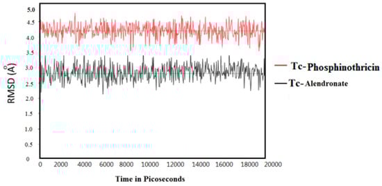 The MD simulations of Tc-phosphinothricin and Tc-alendronate complexes were also conducted to verify if the Tc-complex would affect the binding for a long period of time. According to the results, Tc-alendronate showed more stability with a low RMSD of 3.0, while Tc-phosphinothricin showed stability at a RMSD of 4.3 (Figure 7).