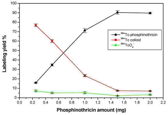 When a small amount of phosphinothricin (0.25 mg) was used, it was insufficient to form complexes with all the reduced technetium present, which was subsequently converted to reduced hydrolyzed 99mTc colloid. This resulted in a low radiochemical yield of 15.9% [18]. The maximum labeling yield of 90.5% was obtained by increasing the phosphinothricin amount to 1.5 mg. Further increases in the amount of phosphinothricin above 1.5 mg did not have any major impact on the labeling yield (Figure 8).